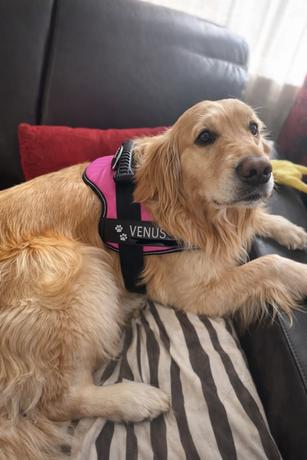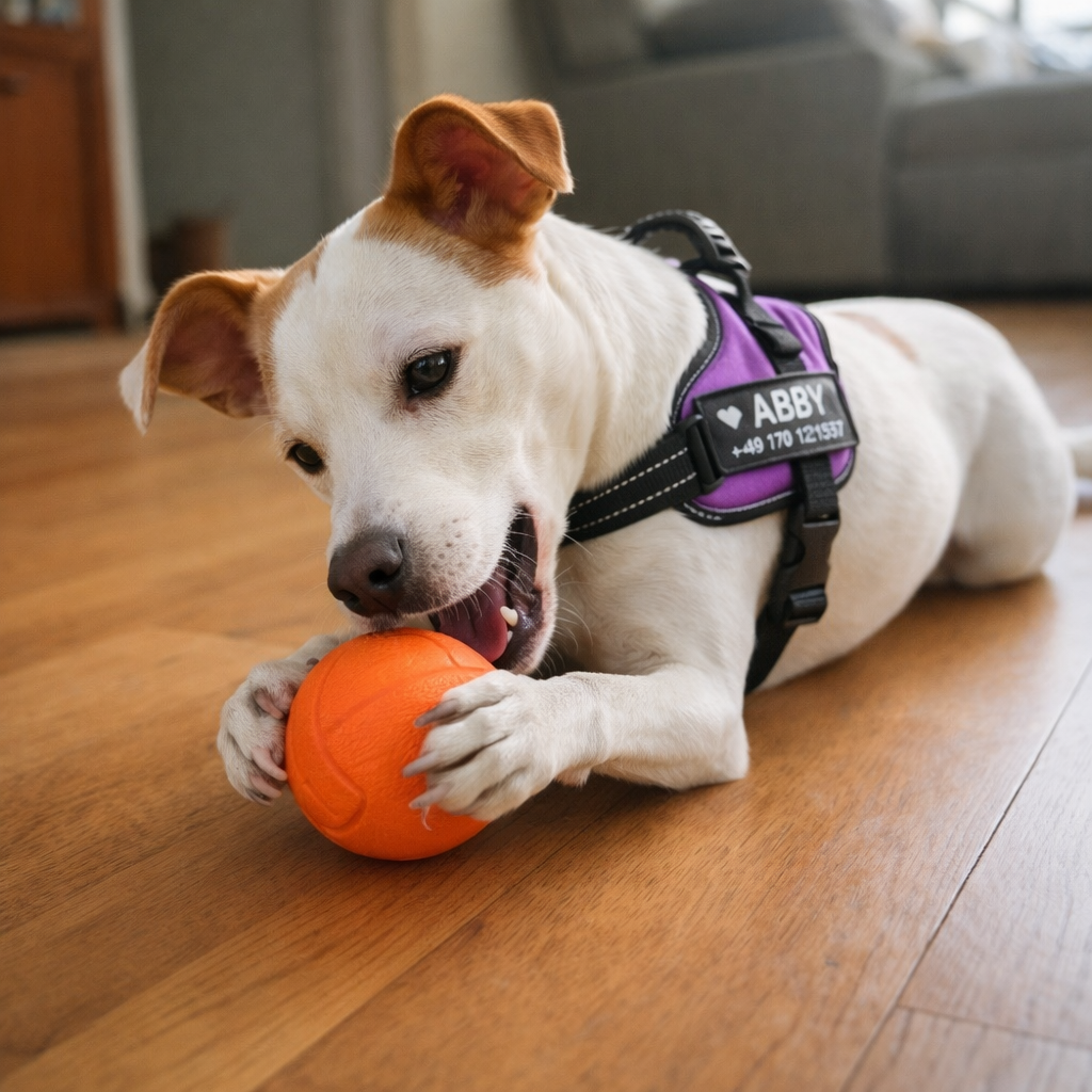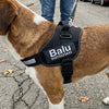 Ein personalisiertes Hundegeschirr mit Namen und Telefonnummer –
